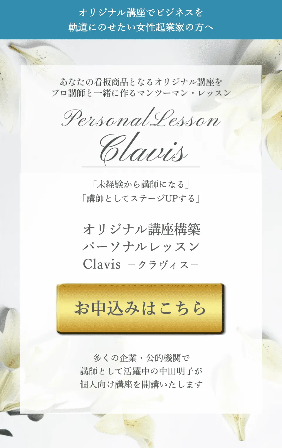 仕事と育児の両立に悩み、将来に希望を感じられない迷いの日々を送った30代、3人の未就学児を抱えて人生を探す学びの旅を始める。数年間で50以上の講座を受講。学ぶことで世界が広がり、生き方が変わる感動を知る。2018年、オリジナル講座提供を軸に起業。講師デビュー初年度より全国の自治体公開講座に10回登壇。リピート・紹介が途切れない講師となる。受講生を思い込みから解放しやる気を起こす講座設計が得意。文科省や上場企業へオリジナル講座を提供するほか、Clavisを主宰。「主役であれ」を理念に、受講生らの人生を後押ししている。